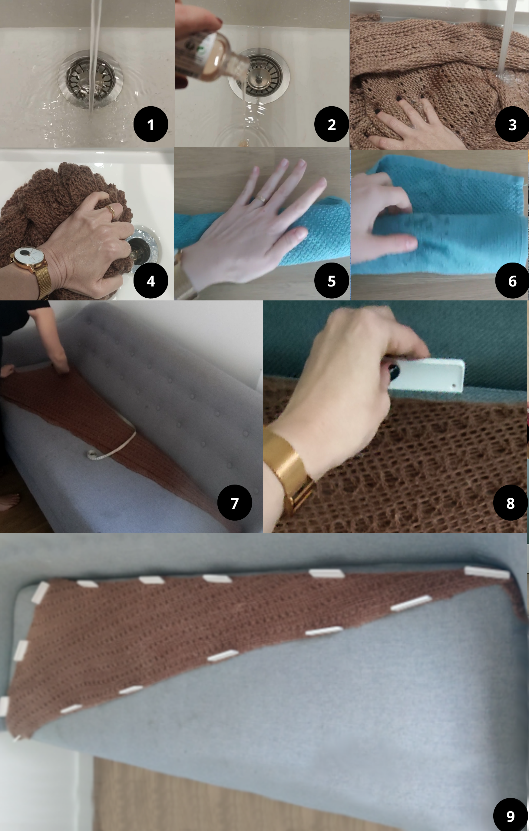 - Drain the water and press your scarf or shawl to remove excess water with the flat of your hand. Do not twist as it breaks the fibers! Also, avoid rubbing as it damages the fibers.