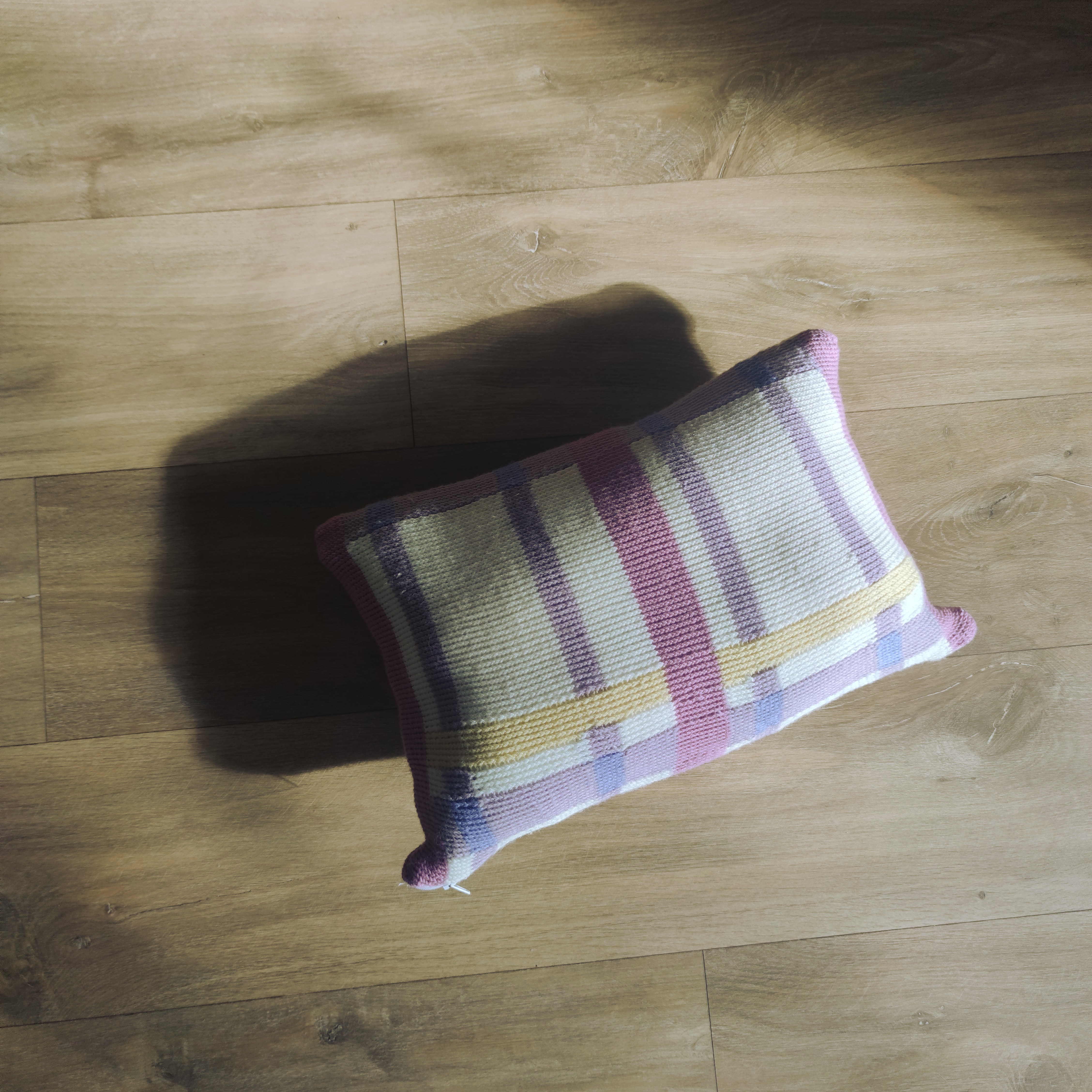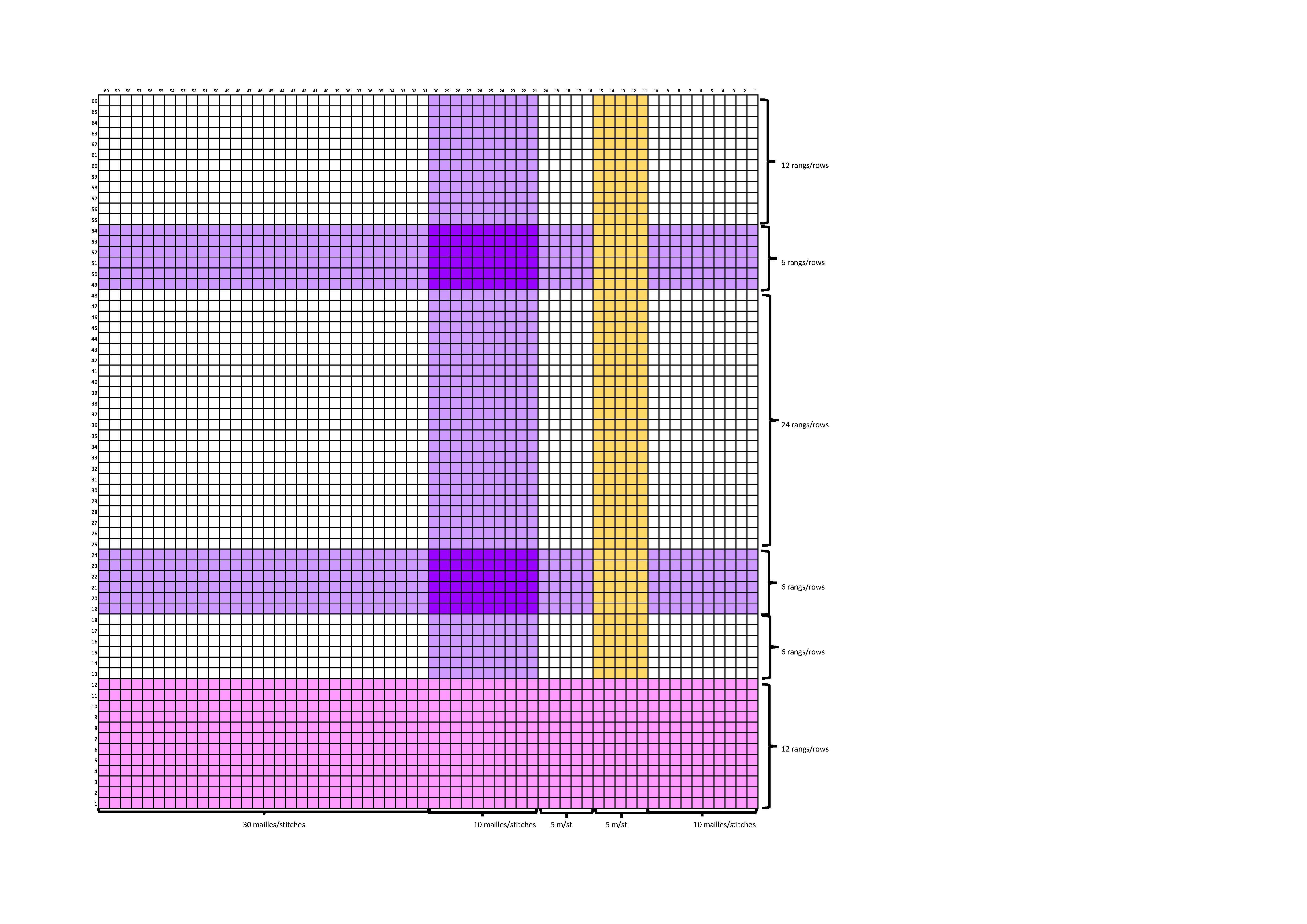 - Replicate the motif pattern below twice in height and finish with a 12-row pink stripe (the first 12 rows of the motif). The finished piece measures 160 stitches in width and 136 rows in height.