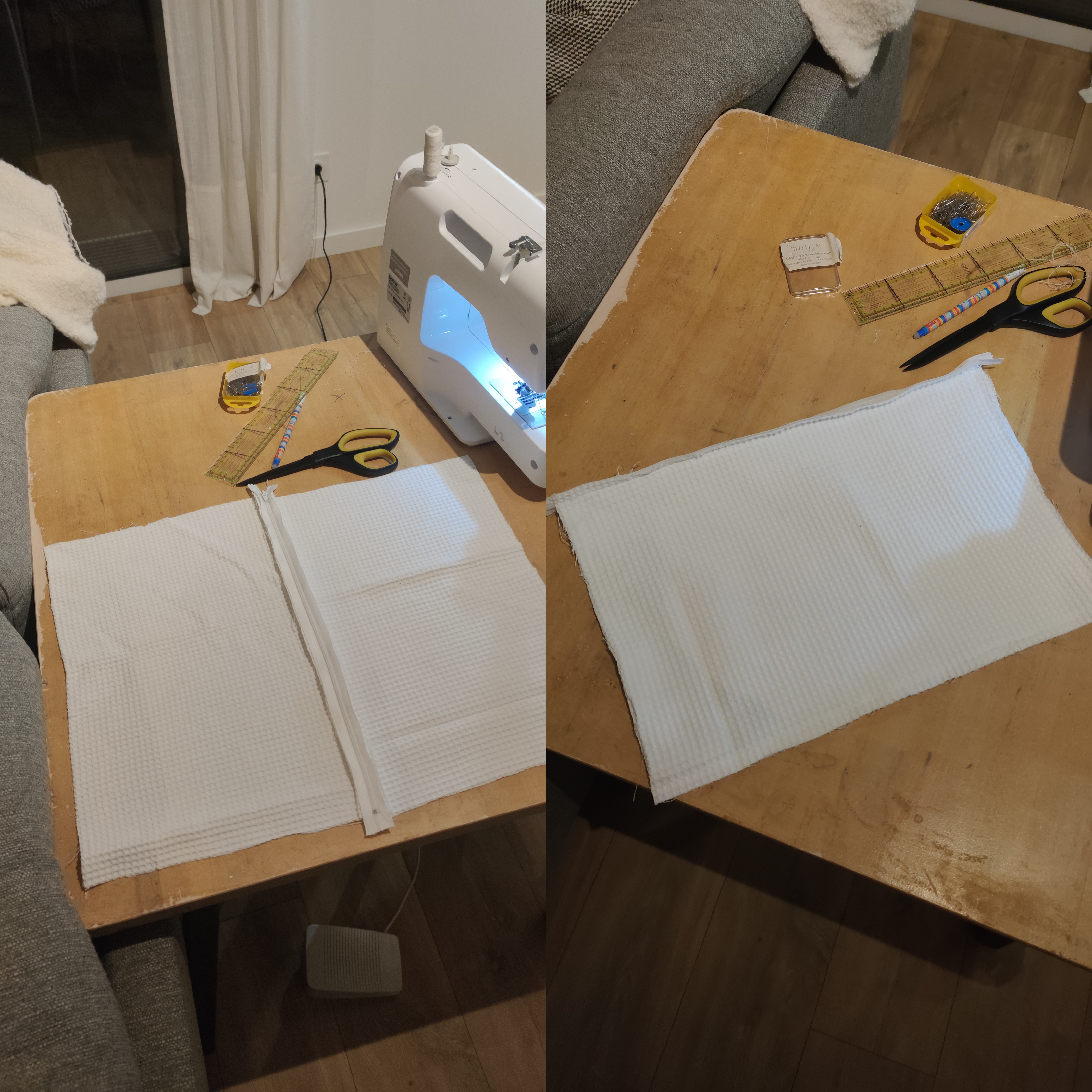 I chose to line the entire piece with fabric to which I attached a 40 cm zipper. For the computer case version, I used a textured honeycomb cotton that provides cushioning to protect the computer from impacts and avoids the use of synthetic padding.