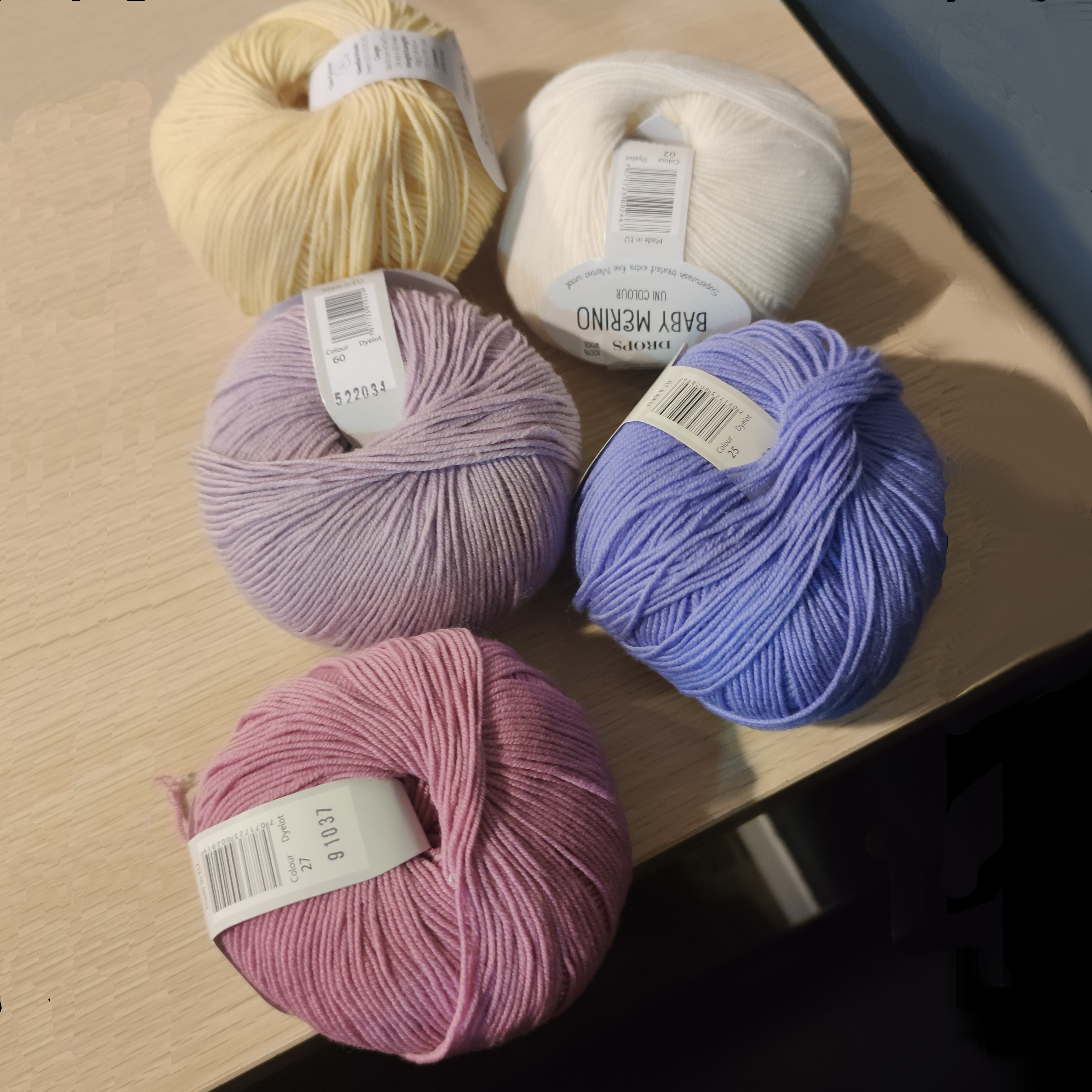 Yarn used : Baby Merino, color Natural 02, Old pink 27, Light purple/frozen lavender 60, Dark purple/Lavander 25 et Yellow 04, Drops