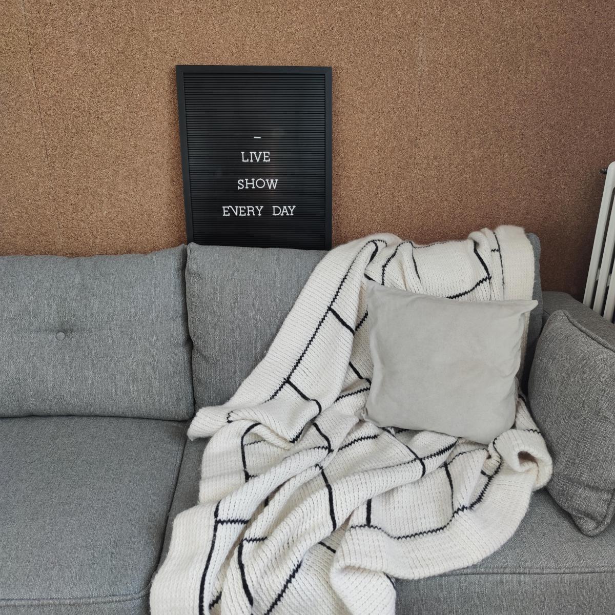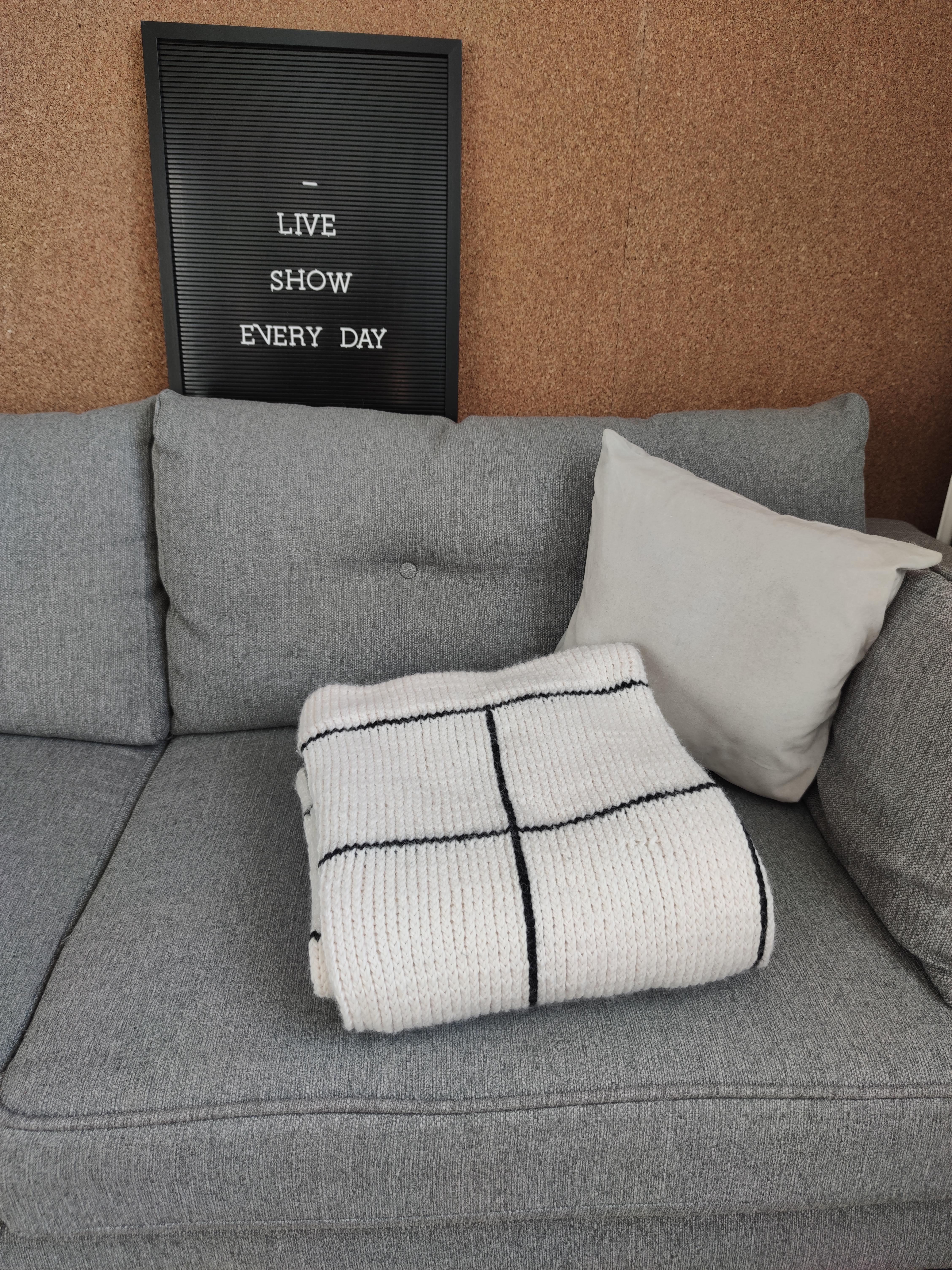 I must admit that it turned out beautifully because it's very comfortable and snug for watching a movie in the evening. Its large dimensions allow you to wrap yourself up in it without your feet sticking out, and it's even spacious enough for two people!