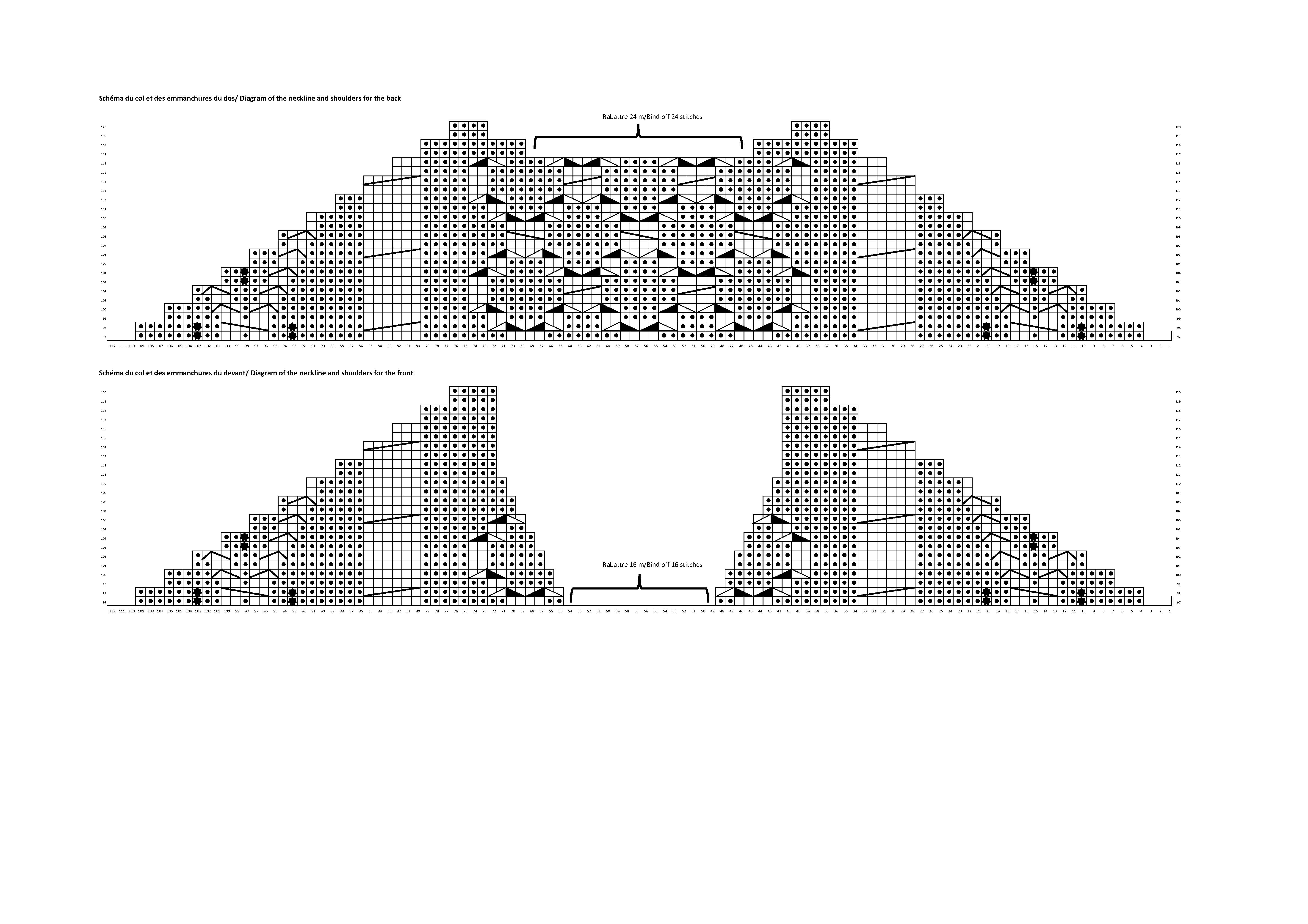 - On the 97th row, refer to the reduction diagrams for the back and front below to draw the necklines and shoulders.
