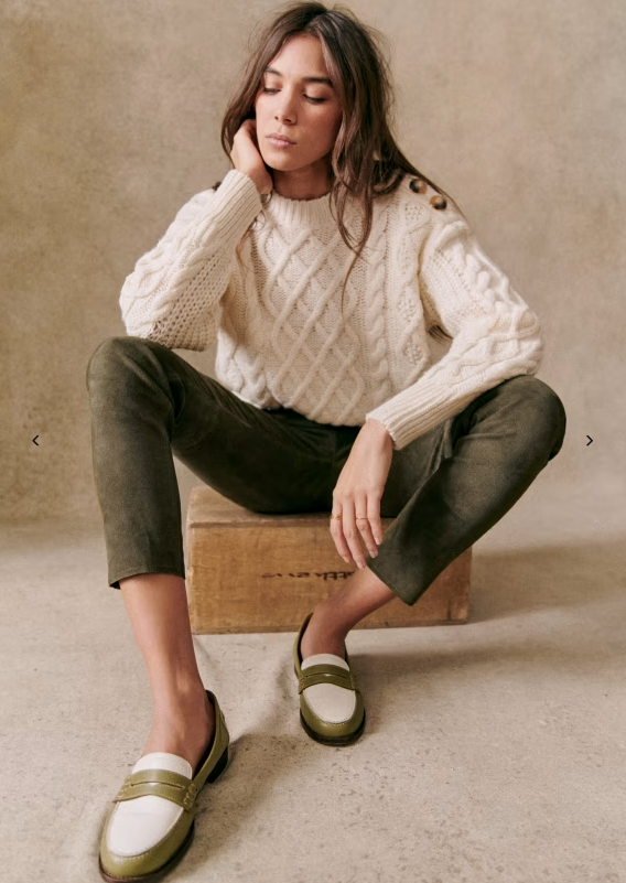 To get back into it, I chose to draw inspiration from the classic Sezane model, the James. I find it very nice with its central cable band and its button placket on the shoulder. Although, in the end, I chose not to put this placket on my final model so as not to stiffen it too much, I kept the principle of the motif on the body: a complex cable in the center, a simple twist on either side framed by large 8s with a textured center.