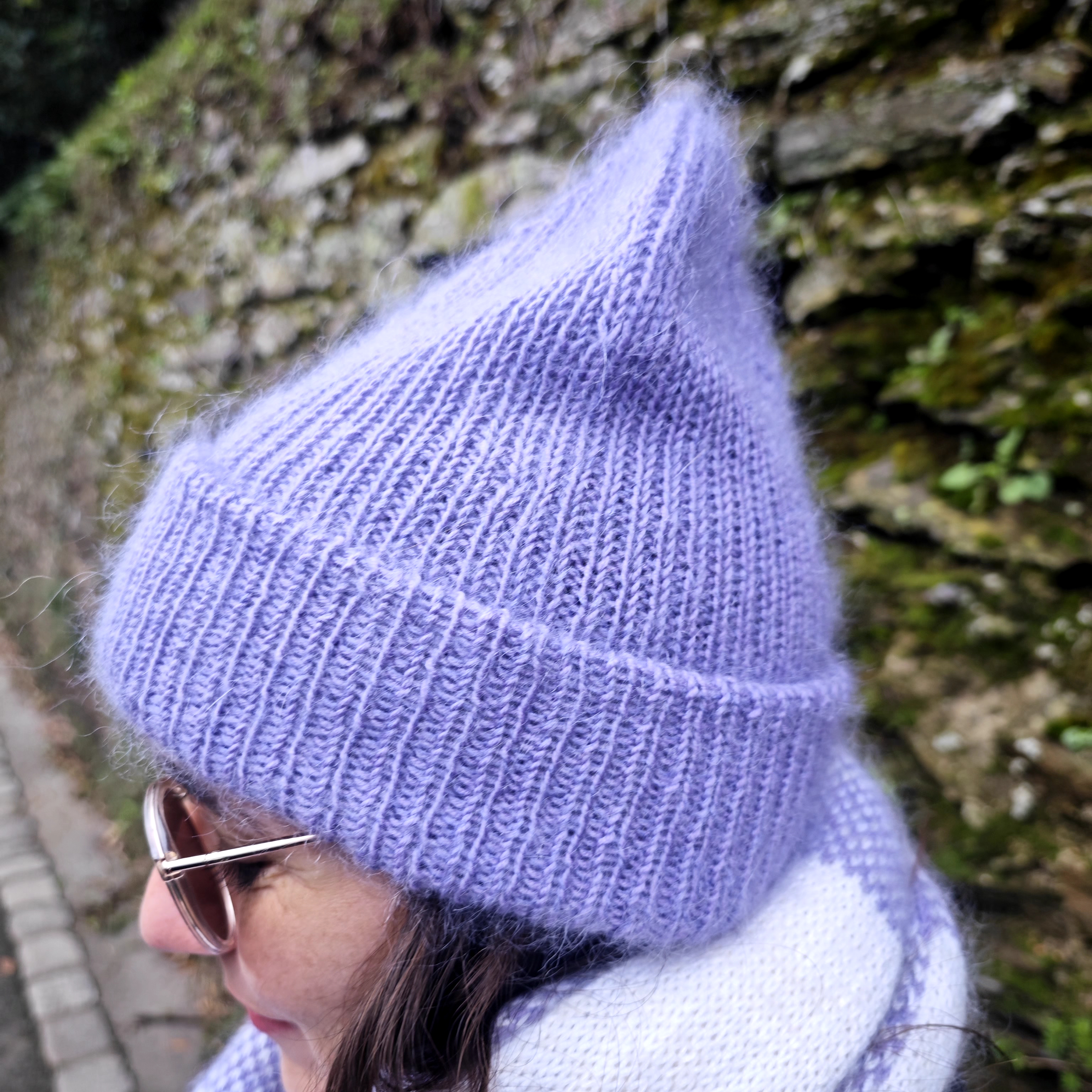Fil utilisé : Baby merino et Kidsilk, coloris Lavande clair (uni color 25 et 17), Drops