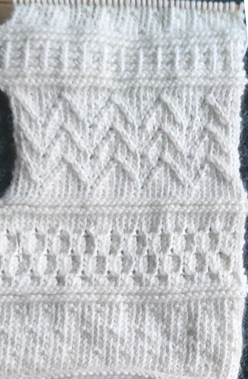 Je l'ai sondé, lui ai montré plusieurs modèles et ceux qui lui faisaient le plus de l'oeil étaient des modèles texturés. Je me suis donc dit que j'allais lui créer un modèle selon ses envies, avec les points qu'il aimait le plus. Toujours grace à mon fidèle compagnon, le livre 750 Knitting Stitches, the Ultimate Knit Stitch Bible aux éditions St Martin's Griffin ainsi qu'à l'aide d'un peu de doc sur internet, je lui ai proposé un échantillon consistant d'une combinaison de motifs horizontaux, losanges et zigzags qu'il m'a validé.
