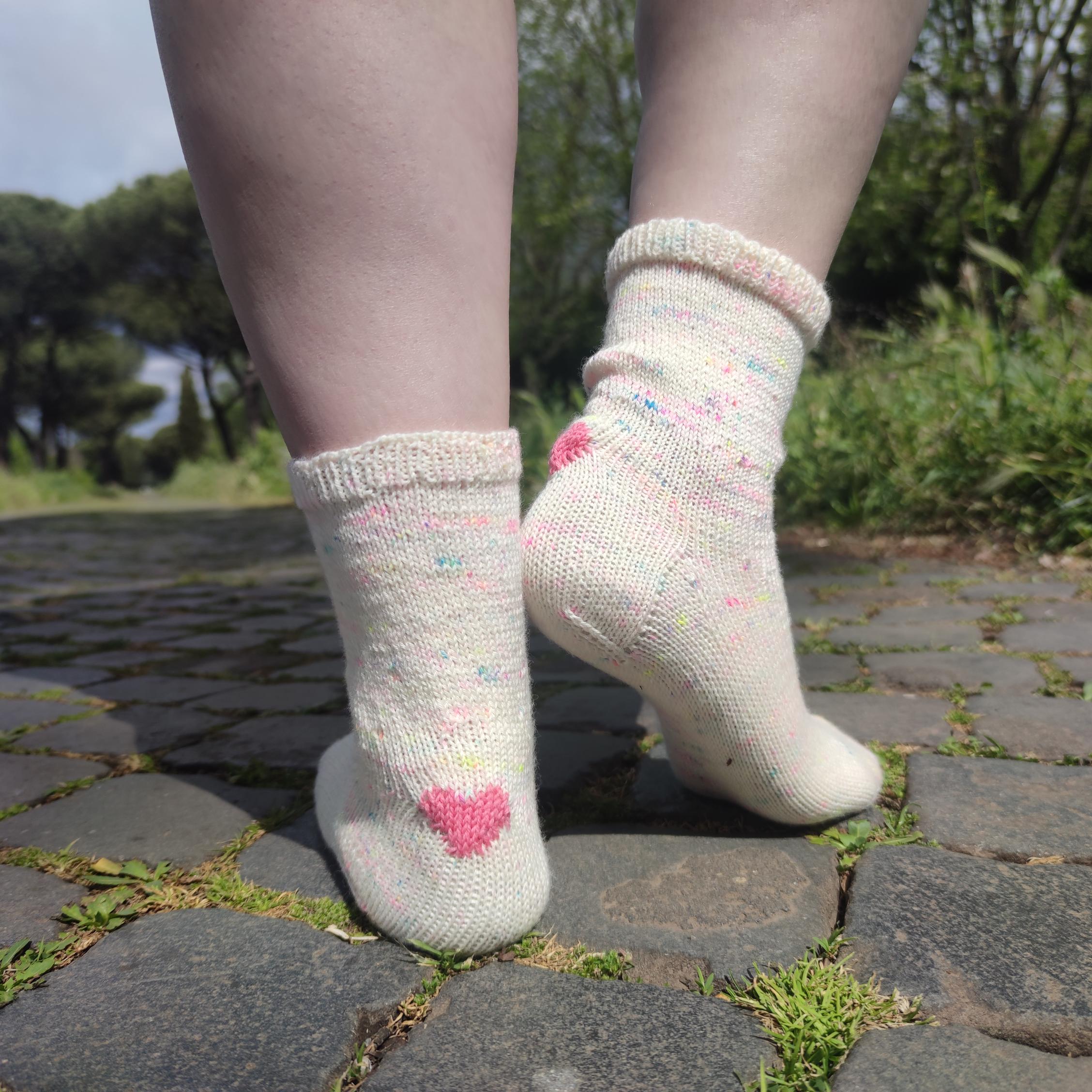 En avril 2024, je me suis lancée dans un voyage en van et j'ai voulu profiter de cette aventure pour créer un patron de chaussettes mignonnes et toutes simples. J'avais envie d'un modèle facile à réaliser pendant mon périple, mais aussi très mignon. C'est ainsi que j'ai créé les chaussettes Tivoli, une paire de chaussettes basiques avec un petit twist : un motif cœur sur le talon qui ressort tout juste au-dessus du haut de la chaussure quand on les porte.